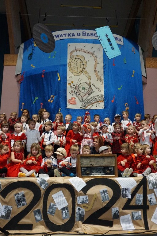 Tegoroczna uroczystość z okazji Dnia Babci i Dziadka odbyła się pod hasłem „Prywatka u Babci i Dziadka”. Nie zabrakło piosenek z czasów młodości babć i dziadków. Klimatu dodał specjalny wystrój hali, gdzie w tym dniu królowały czarno-białe zdjęcia dziadków przodkowskich przedszkolaków, gramofony, kasety, płyty itp.