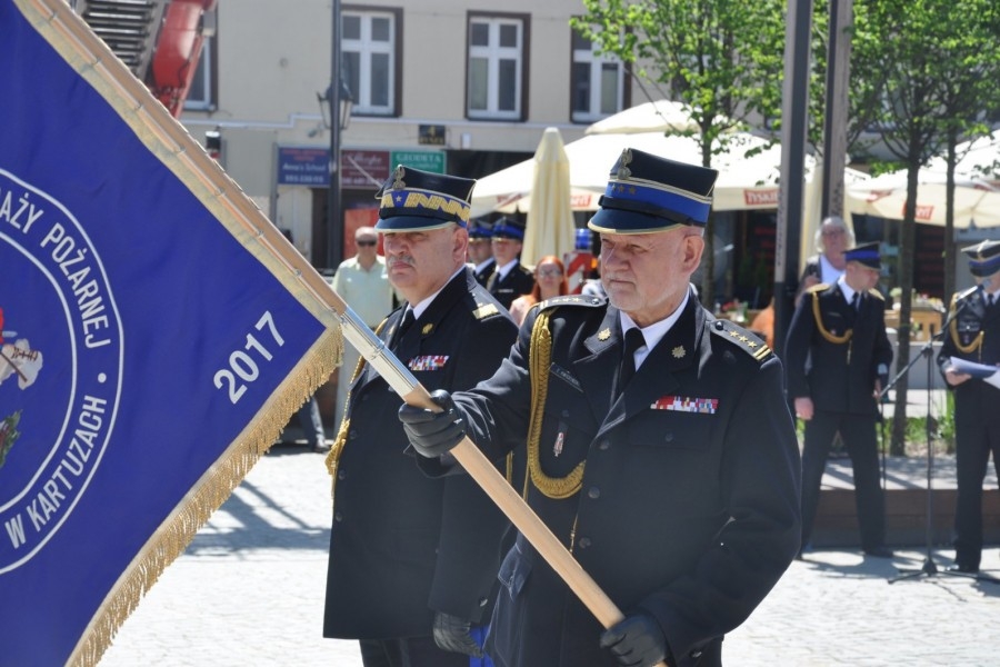 Przybyłych na rynek powitał komendant powiatowy PSP w Kartuzach st.bryg. Edmund Kwidziński. Strażakom podziękował strażakom za służbę i przedstawił historię kartuskiej straży pożarnej. Pamiątkowe gwoździe w drzewiec sztandaru wbili m.in. starosta Janina Kwiecień, posłanka Dorota Arciszewska-Mielewczyk, bp Wiesław Śmigiel i nadbryg. Marek Jasiński.