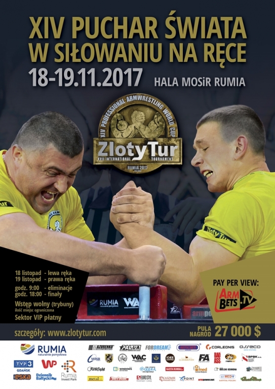 Puchar Świata w Armwrestlingu – Rumia 2017 odbędzie się na hali MOSiR w Rumi przy ul. Mickiewicza 49. Złoty Tur w dniach 18-19 listopad. Puchar Świata Niepełnosprawnych w dniu 20-21 listopada 2017 roku. WSTĘP WOLNY.