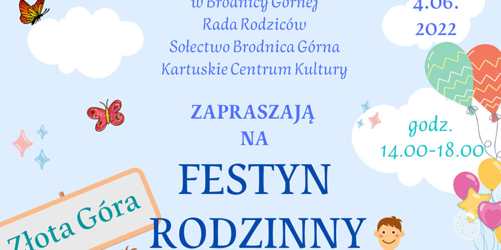 Już w najbliższą sobotę najmłodsi i ich rodziny z Brodnicy Górnej, Kartuz i okolic będą mogli miło spędzić czas na Festynie Rodzinnym z okazji Dnia Dziecka, który odbędzie się na Złotej Górze – rozpoczęcie imprezy zaplanowano na godzinę 14. Na scenie wystąpią m. in. dzieci ze szkoły w Brodnicy Górnej – „Music Kids” i „Skarb Złotej Góry”, przewidziany jest również występ zespołu „Abba Show” i wiele innych atrakcji. Zobacz plakat wydarzenia!