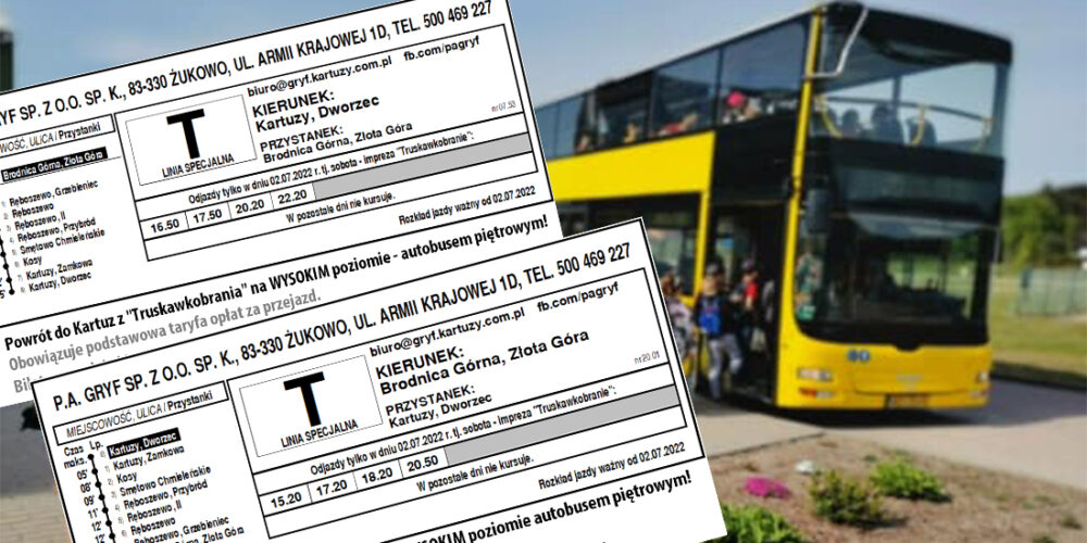 Na tegoroczną edycję Truskawkobrania będzie można dojechać z Kartuz piętrowym autobusem, specjalnie przygotowanym na tę okazję przez firmę „Gryf”. Pojazd pomieści 84 osoby na miejscach siedzących i umożliwi również powrót po koncertach na Złotej Górze do „stolicy Kaszub”. Popularne „święto truskawki” już 2 lipca, a na scenie pojawią się m. in. Poparzeni Kawą Trzy oraz Jula. Zobacz rozkład jazdy autobusu!