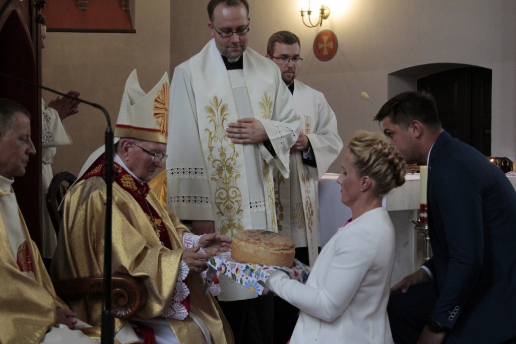 Przekazanie chleba, wypieczonego z tegorocznego ziarna, przez starostów dożynek Janinie Kwiecień staroście kartuskiemu i Andrzejowi Wyrzykowskiemu wójtowi gminy Przodkowo odbyło się na scenie. Nim to jednak nastąpiło włodarze witali gości. Trwało to dość długo. W końcu jednak powitali i bohaterów święta plonów. Przekazane bochny chleba trafiły w ręce starosty i wójta. Ci częstowali nim zgromadzonych na stadionie mieszkańców gminy.