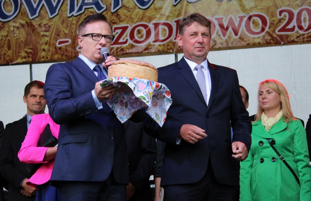 Przekazanie chleba, wypieczonego z tegorocznego ziarna, przez starostów dożynek  Janinie Kwiecień staroście kartuskiemu i Andrzejowi Wyrzykowskiemu wójtowi gminy Przodkowo odbyło się na scenie. Nim to jednak nastąpiło włodarze witali gości. Trwało to dość długo. W końcu jednak powitali i bohaterów święta plonów. Przekazane bochny chleba trafiły w ręce starosty i wójta. Ci częstowali nim zgromadzonych na stadionie mieszkańców gminy.