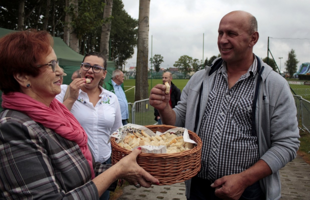Przekazanie chleba, wypieczonego z tegorocznego ziarna, przez starostów dożynek Janinie Kwiecień staroście kartuskiemu i Andrzejowi Wyrzykowskiemu wójtowi gminy Przodkowo odbyło się na scenie. Nim to jednak nastąpiło włodarze witali gości. Trwało to dość długo. W końcu jednak powitali i bohaterów święta plonów. Przekazane bochny chleba trafiły w ręce starosty i wójta. Ci częstowali nim zgromadzonych na stadionie mieszkańców gminy.