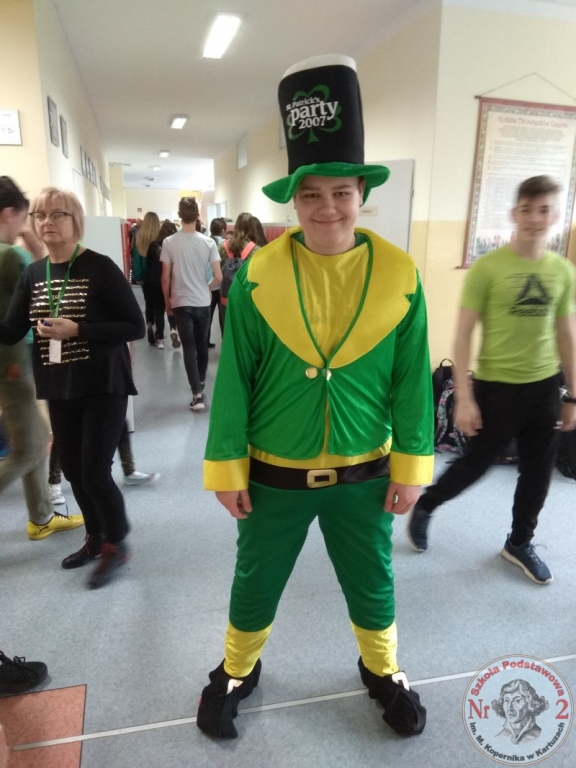 Społeczność szkolna była tego dnia ubrana na zielono a w salach lekcyjnych powstały piękne okolicznościowe gazetki. W programie dnia były lekcje kulturowe z języka angielskiego dedykowane świętemu Patrykowi, każda klasa przygotowała również kapelusz Leprechauna, a ich dzieła można było podziwiać na wystawie na pierwszym piętrze. Podczas przerw uczniowie mieli okazję posłuchać muzyki irlandzkiej i zrobić sobie pamiątkowe zdjęcie ze skrzatem. Hitem dnia okazał się sklepik słodkości przygotowanych przez uczniów, rodziców i nauczycieli. Można było zakupić i skosztować pyszności w kolorach Irlandii: zielonym, białym i pomarańczowym. Było tam wszystko czego dusza zapragnie: cukierki, galaretki, babki, babeczki, ciasteczka i ciasta. Dochód ze sprzedaży słodkości wesprze cel charytatywny – pomoc finansową na zakup protezy ręki dla Pauliny Kunowskiej z Miszewka.