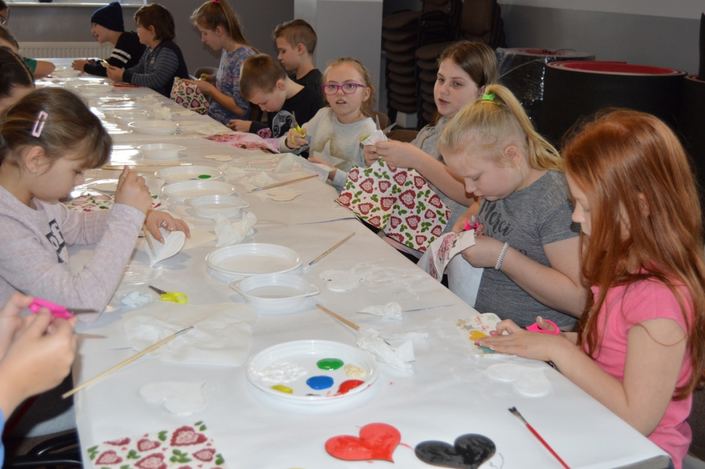 Ferie to okazja do poznawania nowych rzeczy. Podczas zabaw manualnych dzieci własnoręczne wykonywały walentynkowe serduszka na drewnie metodą decoupage, kolorowe bałwanki ze skarpetek, pingwinki z wytłaczanek a dużo radości przyniosła uczestnikom zajęć własnoręcznie przygotowana kolorowa masa – piankolina.