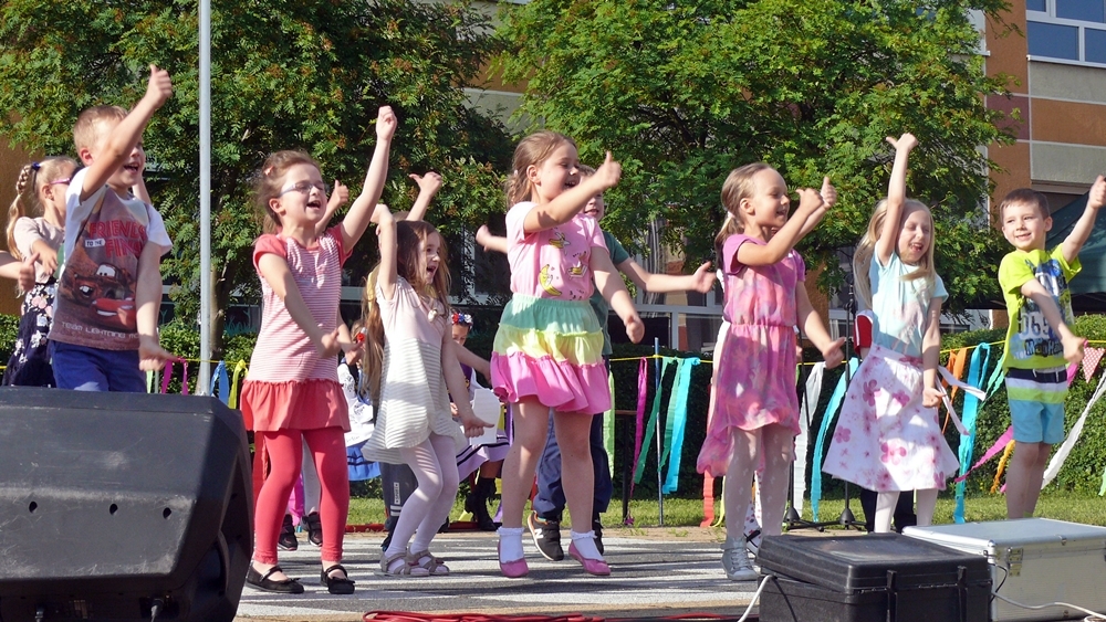 Od godziny 17.00 na scenie przy szkole występowały dzieci. Grupy przedstawiały układy taneczne i śpiewały. Przegląd talentów rozpoczął Regionalny Zespół Dziecięcy Słunôszka.