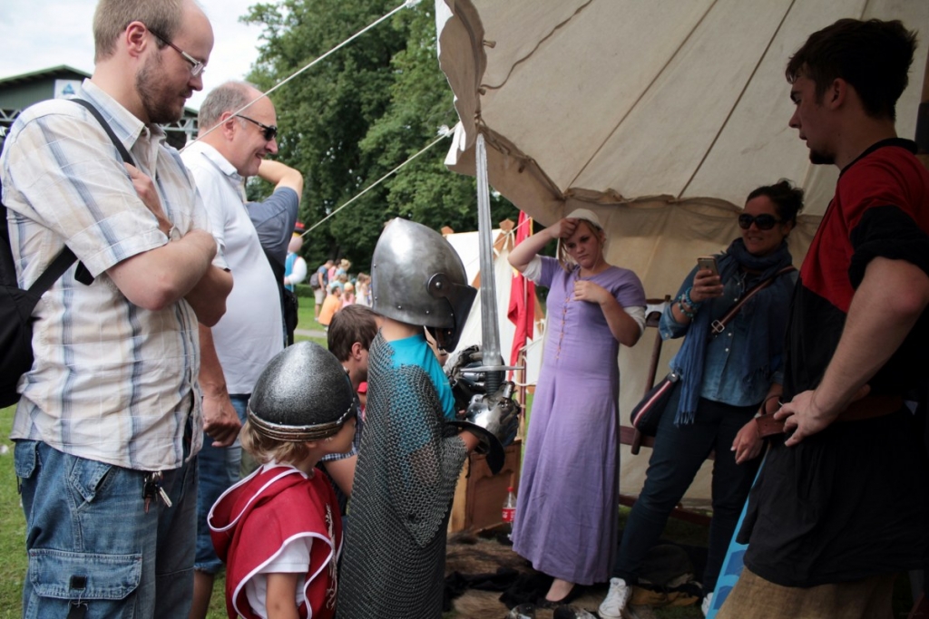 Pogoda dopisała, mieszkańcy i turyści nie zawiedli. Przybyli całymi rodzinami. Epoka rycerzy wciąż ciekawi. Przyciągają zbroje, stroje, pojedynki, zwyczaje… W parku stanęły namioty i stragany. Jest zbrojownia. Jest kat i są dyby. Odbywa się jarmark. W programie między innymi pokazy walk rycerskich, ubierania zbroi i pasowania na rycerza.