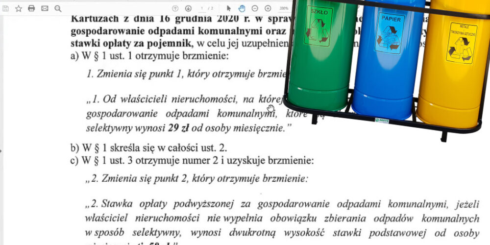 Radni ustalili, że za gospodarowanie odpadami w sposób selektywny trzeba będzie płacić 29 złotych od osoby. Wcześniej było to 23 złote. Jeśli zaś właściciel nieruchomości nie zbiera odpadów komunalnych selektywnie, zapłaci dwukrotną wysokości stawki podstawowej, czyli 58 złotych od osoby. Większość radnych była „za” (11 głosów), jednak niektórzy, m. in. Tomasz Belgrau, Aleksandra Pruszak czy Mariusz Treder wstrzymali się od głosu (5 głosów) lub byli przeciw (3 głosy).