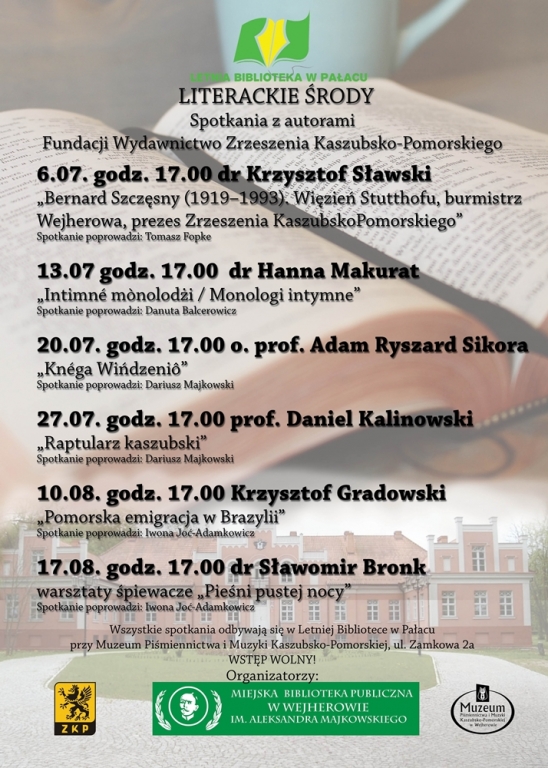 Literackie środy w Wejherowie Dnia 30 czerwca 2016 Więcej w Kultura: Sztab WOŚP w gminie Szemud zebrał ponad 130 tyś. Zagrał zespół New Blues Batalion 29 stycznia 2025 Złote i Diamentowe Jubileusze Miłości w Gołubiu (wideo) 13 grudnia 2024 Przodkowo. „Rok Odlotowej Mamy” w bibliotece 26 listopada 2024 Muzeum Piśmiennictwa i Muzyki Kaszubsko-Pomorskiej w Wejherowie zaprasza na „LITERACKIE ŚRODY. Spotkania z autorami”. Będą się one odbywać w środy w Letniej Bibliotece w Pałacu. Początek o godz. 17. Wstęp wolny. Letnia_2016_RGB-1 Zdjęcie 1 z 1 Muzeum w Wejherowie Podobne artykułyAkumulator Społeczny Żukowo: sięgnij po funduszeWigilia Baśkarzy w gościnnej SzopiePiotr Zatoń, dyrektor GOK-u w Sulęczynie: „Odnajduję się w nowej rzeczywistości…”Gm. Przodkowo. Szykują się utrudnienia w ruchuWachlarz wodnych atrakcji (i nie tylko) w samym sercu Kaszub!W poniedziałek rusza przebudowa ul. Pogodnej w Grzybnie. Będą utrudnienia!