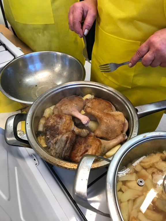 Grupa druga – niebieska pod przewodnictwem pani Bogusi i pani Aldony podała pieczoną pierś z kaczki z zapiekanymi ziemniakami oraz z sosem żurawinowo-czosnkowym. Jeżeli chodzi o deser to grupa niebieska przygotowała pieczone jabłka z cukrem.