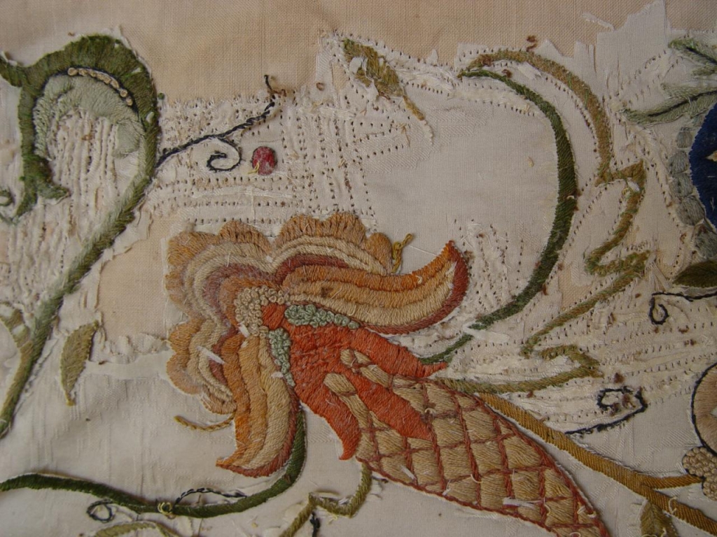 Zastosowany w baldachimie haft to lekkie kompozycje złożone z bogatej palety wielobarwnych motywów charakterystycznych dla wdzydzkiego rękodzieła. Występują tu różne typy tulipanów, kwiaty i owoce granatu, serca, róg obfitości, dzwonki, niezapominajki, wisienki, półgwiazdy, trzy rodzaje liści. Perfekcyjnie zgrane ze sobą motywy, pastelowe kolory, i grające światłem i fakturą ściegi nadają całości harmonii, wyrafinowanego wdzięku i stylowości. W hafcie zastosowano kolor niebieski, czerwony, pomarańczowy, brązowy, różowy, żółty, zielony, czarny, każdy z nich w dwóch lub nawet trzech odcieniach – czyli razem około dwudziestu barw.