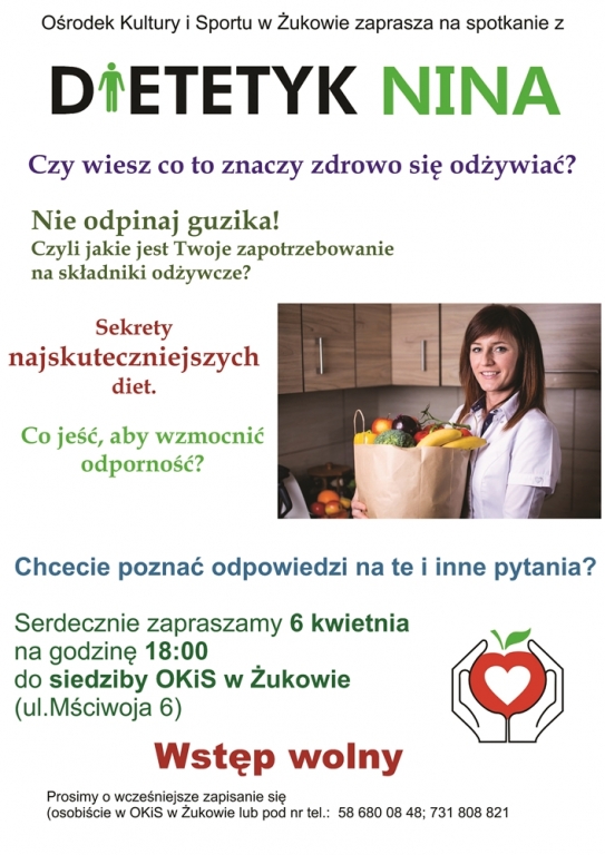 6 kwietnia w Żukowie odbędzie się spotkanie z dietetyczką Niną. Zaprasza na nie OKiS Żukowo. Wstęp wolny. Obowiązują zapisy.