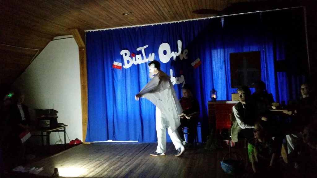 Uczniowie klasy VIIb pod kierunkiem wychowawczyni Honoraty Kuziemkowskiej zaprezentowali program artystyczny „Pisk Białego Orła” według scenariusza Adama Szafrańca. Spektakl opowiadał historię wielopokoleniowej wiejskiej rodziny. Jej członkowie otrzymali solidne tradycyjne wychowanie z naciskiem na patriotyczne wartości. Ich życie było przepojone miłością do Ojczyzny, gotowi byli na różne poświęcenia z narażeniem życia włącznie. Pod swoim dachem ukrywali poetę. Człowiek ów oczytany i mądry, odwołując się do literatury i poezji okresu zaborów jeszcze bardziej wzmacniał w nich wolę walki i ofiarności za wolność ukochanej Ojczyzny. Legenda o Białym Orle została opowiedziana słowami lektora, nastrojową muzyką oraz tańcem dziewcząt w teatrze cieni do której idealnie wpasowali się występujący uczniowie.