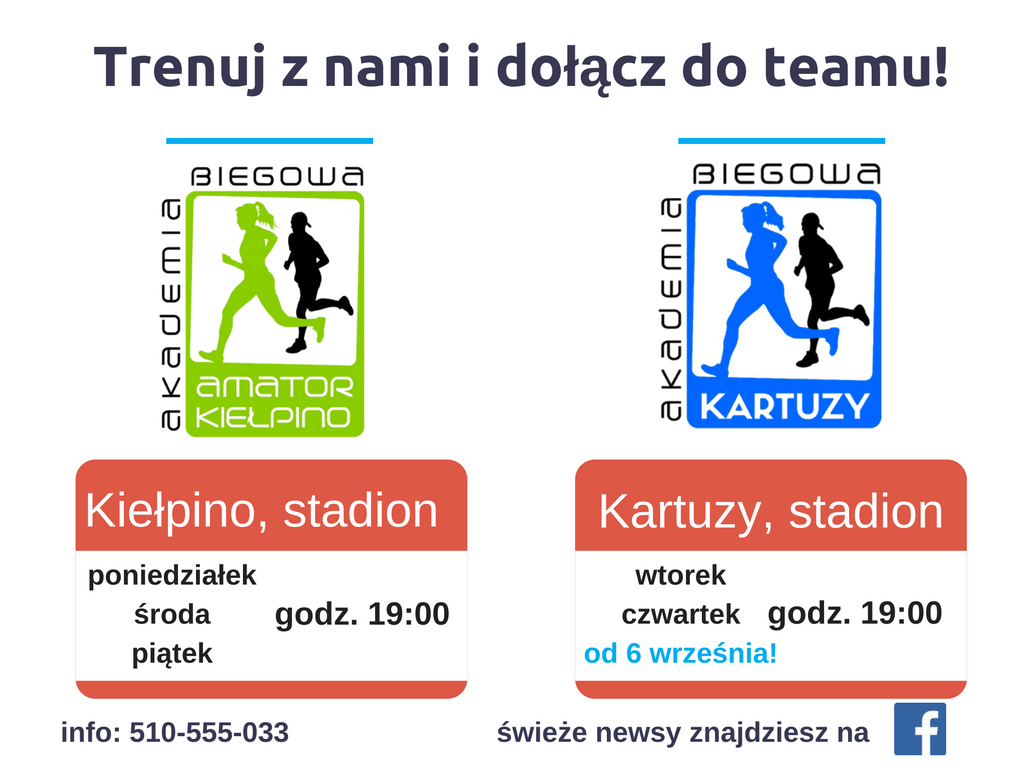Karol Nowakowski od roku z powodzeniem prowadzi Akademię Biegową Amator w Kiełpinie, w zajęciach której uczestnicy regularnie kilkanaście osób, a zdarza się czasem, że nawet kilkadziesiąt. Teraz taką możliwość będą mieli mieszkańcy Kartuz. Szkoleniowiec na profesjonale treningi zaprasza nie tylko biegaczy doświadczonych, ale także początkujących.