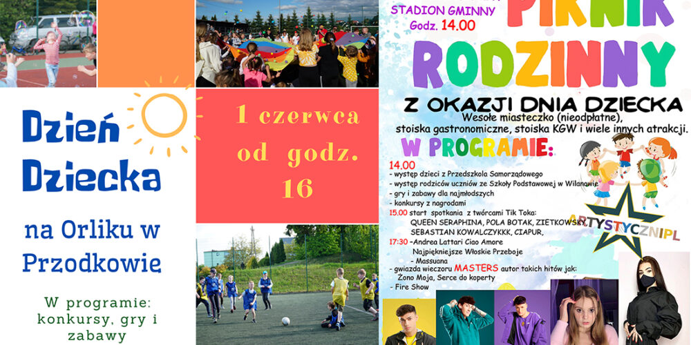 Najmłodsi z Przodkowa i okolic mają powody do radości – z okazji Dnia Dziecka w stolicy gminy odbędą się aż dwie imprezy plenerowe – pierwsza 1 czerwca, a druga 5-go. Na obu wydarzeniach nie zabraknie licznych atrakcji dla dzieci, takich jak zabawy z animatorem, konkursy z nagrodami czy spotkania z… tik-tokerami. Ponadto na niedzielnym (5 czerwca) pikniku wystąpi zespół Masters, znany m. in. z utworu „Żono moja”. Koniecznie zobacz plakaty obu wydarzeń!