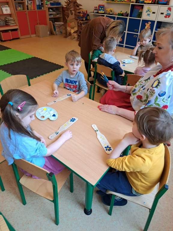 Pierwszego dnia dzieci spotkały się z Bożeną Kupper-Krzyżanowską, która przeprowadziła pokaz przędzenia wełny oraz warsztaty plastyczne. Dzieci samodzielnie malowały wzory kaszubskie na drewnianych łopatkach.