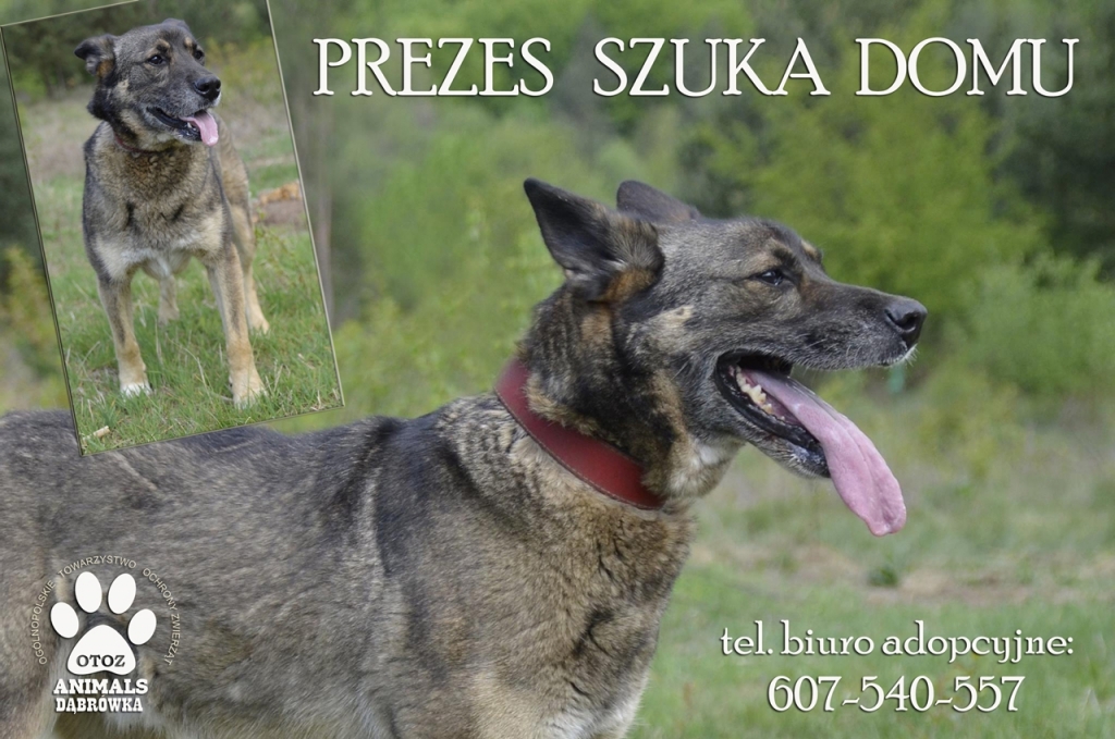 Prezes może mieć 8 lub 9 lat. Pies został wykastrowany. Jest - jak przyznają pracownicy schroniska - typ burka idealnego! Prezes jest psem pogodnym, wesołym, chętnym do zabawy. Nie sposób go nie pokochać. Prezes nie lubi jednak osób starszych, co było też powodem jego powrotu z adopcji. Poza tym Prezes nie ma wad. Na spacerach grzeczny, ułożony, bardzo lubi biegać, ale nie zmusza do tego prowadzącego. Lubi mieć wszystko pod kontrolą. Pod tym względem jest niewątpliwie psem pasterskim. Gdy idzie na spacer z dwoma osobami cały czas ma je pod swoją kuratelą. Gdy jedna przystaje by zawiązać but, Prezes ogląda się za nią i czeka aż wróci. Prezes jest jednak przede wszystkim wspaniałym psem stróżującym. Biegając po ogrodzonym terenie, mając wszystko pod swą kontrolą, alarmując właściciela w razie potrzeby- Prezes będzie w siódmym niebie! Fot.: Ania Szczepaniak