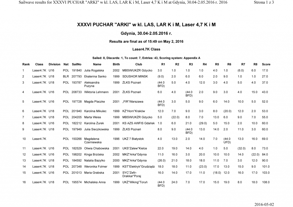 Na wodach Zatoki Gdańskiej od soboty, 30 kwietnia do poniedziałku, 2 maja odbywały się regaty XXXVI Pucharu MKŻ Arka Gdynia. Zawodnicy rywalizowali w klasie Laser Standard, Laser Radial i Laser 4.7.