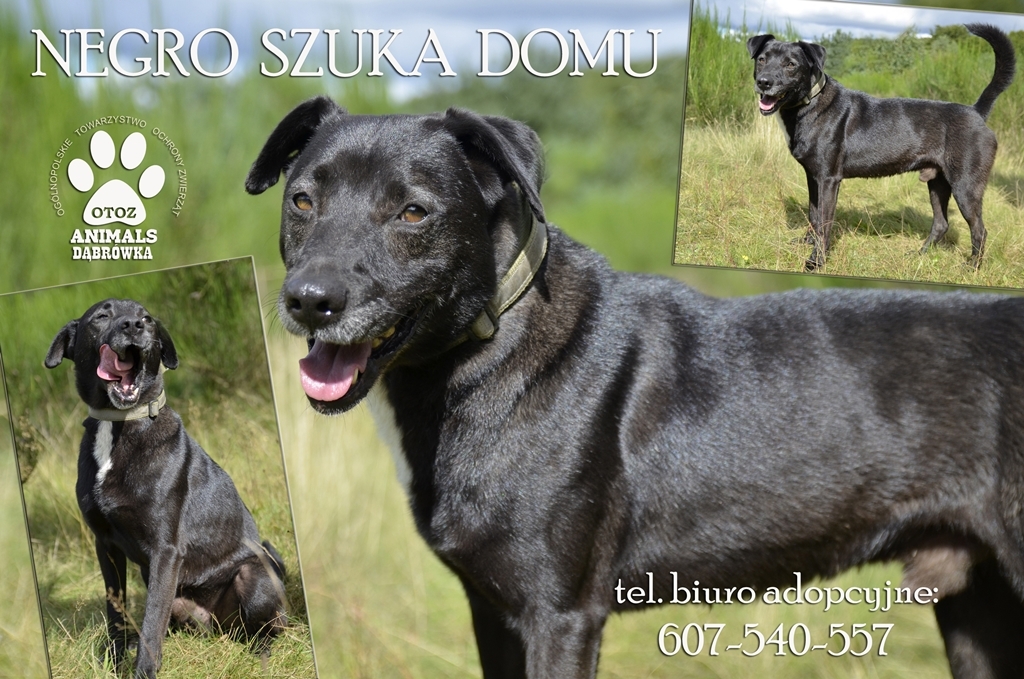 Negro jest w schronisku od 24 września 2013 roku. Do Dąbrówki został przywieziony z terenu gm. Łęczyce. Ma obecnie ok 7 lat ale duchem z pewnością dorówna nie jednemu młodzikowi. Szuka domu, w którym panuje miłość. Negro to średniej wielkości psiak, przyjazny i kochany. Wciąż zaskakuje nas swoimi umiejętnościami, pomimo rzadkich spacerów w schronisku on pięknie chodzi przy nodze, nie szarpie, nie ciągnie. Wpatrzony w człowieka podąża za jego krokiem. Fot.: OTOZ Animals Dąbrówka