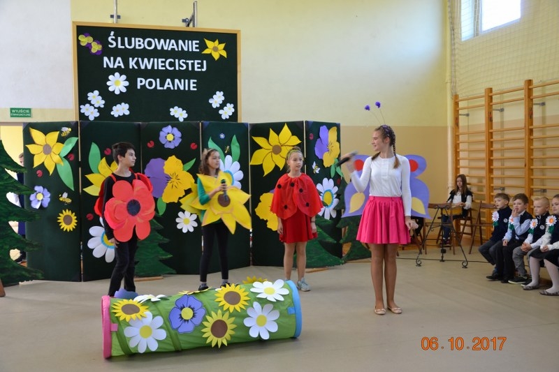 Uroczystość rozpoczęła p. dyrektor Renata Stubińska Nalewajek, która powitała przybyłych gości i przybliżyła dzieciom istotę wyjątkowego ceremoniału ślubowania. Na początku jednak, dzieci zostały powitane na „Kwiecistej Polanie” przez jej mieszkańców: Motyla, Słonecznika, Maka i Biedronkę, by przejść wesoły test sprawnościowy na koniec którego pasowania dokonała z-ca dyr. Małgorzata Kurkowska.
