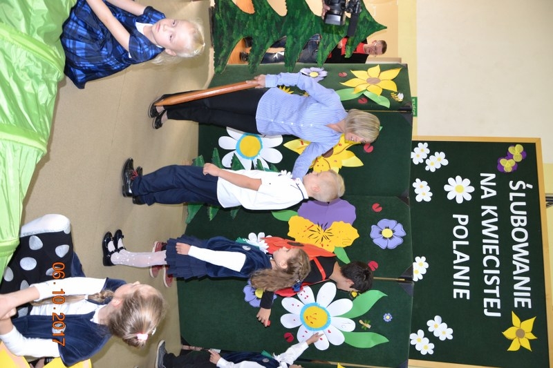 Uroczystość rozpoczęła p. dyrektor Renata Stubińska Nalewajek, która powitała przybyłych gości i przybliżyła dzieciom istotę wyjątkowego ceremoniału ślubowania. Na początku jednak, dzieci zostały powitane na „Kwiecistej Polanie” przez jej mieszkańców: Motyla, Słonecznika, Maka i Biedronkę, by przejść wesoły test sprawnościowy na koniec którego pasowania dokonała z-ca dyr. Małgorzata Kurkowska.