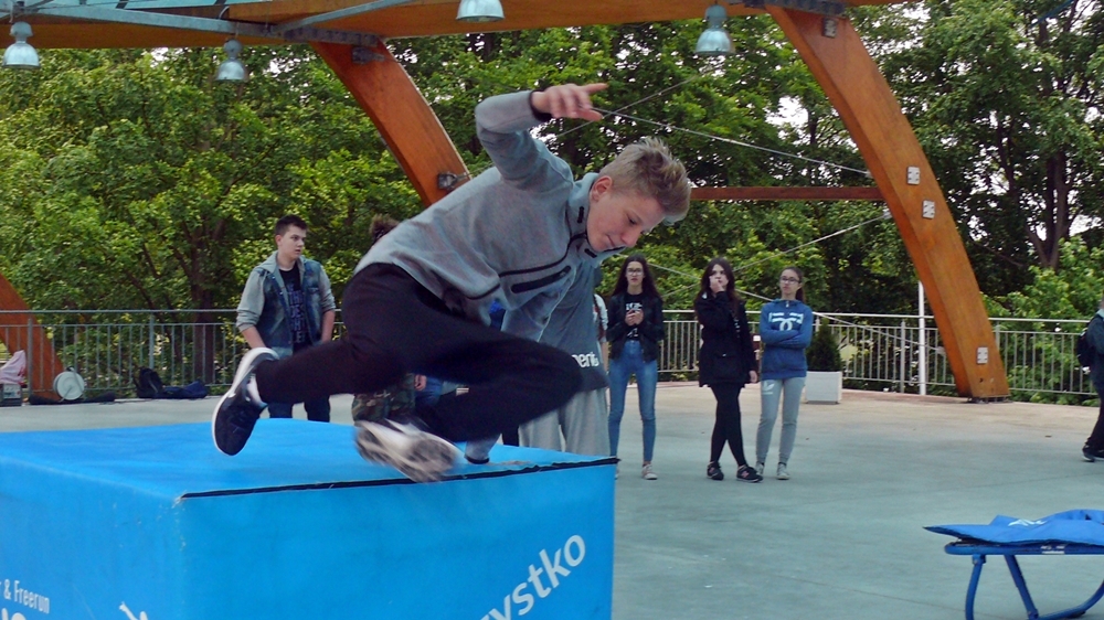 Zajęcia z parkour przygotowali dla nich instruktorzy z Klubu Sportowego Movement. Na 5 stanowiskach przygotowano przeszkody, oraz uczono dzieci jak efektownie je pokonywać. Warsztaty poprzedził pokaz umiejętności członków grupy.