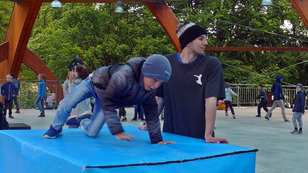 Zajęcia z parkour przygotowali dla nich instruktorzy z Klubu Sportowego Movement. Na 5 stanowiskach przygotowano przeszkody, oraz uczono dzieci jak efektownie je pokonywać. Warsztaty poprzedził pokaz umiejętności członków grupy.
