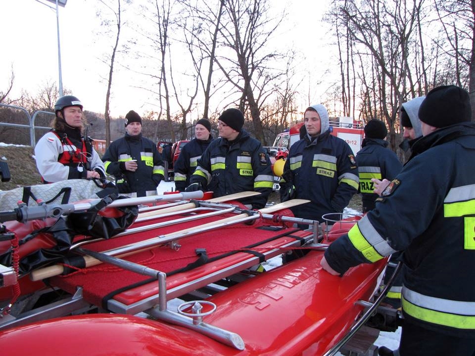 Strażacy omawiali i ćwiczyli manewrowanie na wodzie i lodzie, techniki ratownictwa lodowego, sondowanie lodu, udzielanie pierwszej pomocy ofiarom hipotermii itp.