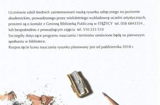 W Gminnej Bibliotece Publicznej w Stężycy organizowane będą kursy rysunki. Zajęcia skierowane są do uczniów szkół średnich.