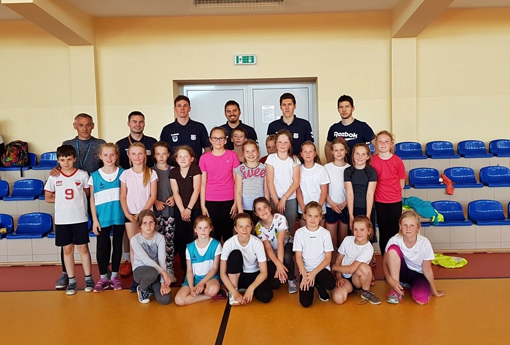 Uczniowie z Banina rozpoczęli trening od solidnej rozgrzewki. Zawodowcy podpowiadali im, jak rozgrzać poszczególne części ciała, i jak rozciągać ciało aby uniknąć kontuzji. Młodzi szczypiorniści, a właściwie szczypiornistki bo to one przeważały na hali w Zespole Szkół w Baninie, chętnie wykonywały wszelkie polecenia.
