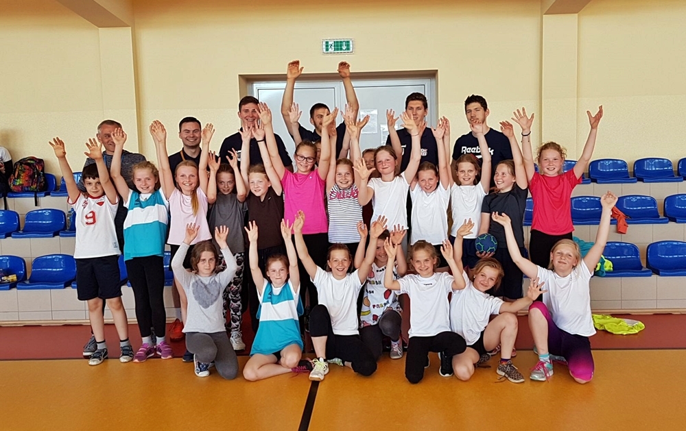 Uczniowie z Banina rozpoczęli trening od solidnej rozgrzewki. Zawodowcy podpowiadali im, jak rozgrzać poszczególne części ciała, i jak rozciągać ciało aby uniknąć kontuzji. Młodzi szczypiorniści, a właściwie szczypiornistki bo to one przeważały na hali w Zespole Szkół w Baninie, chętnie wykonywały wszelkie polecenia.