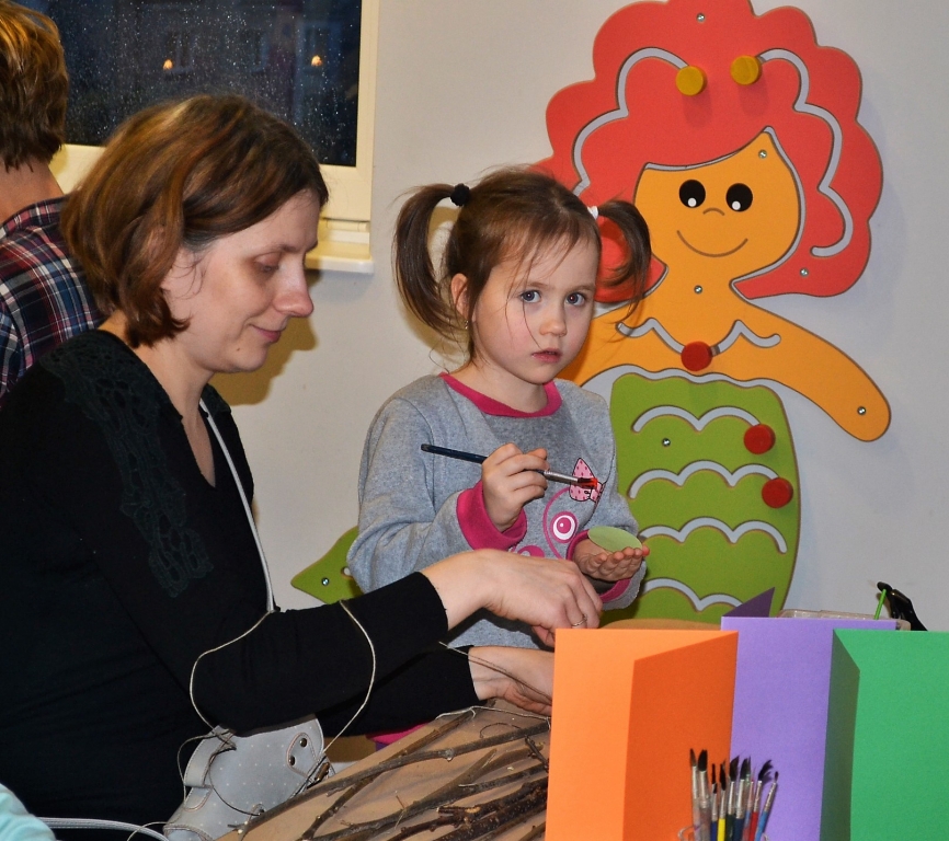Rodzice z dziećmi przygotowali świąteczne ozdoby i kartki. Do wyboru mieli całe mnóstwo kolorowych kartek, farb i różnych dodatków, więc każda ozdoba była wyjątkowa. Wychowawczynie grupy „Rybek” – Sandra Zoch i Monika Plichta zadbały o to, żeby nikomu niczego nie zabrakło.