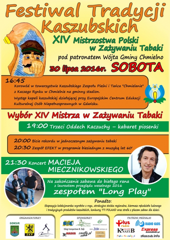 Podróżując w weekend po Kaszubach nie tylko warto, ale trzeba wjechać do Chmielna, gdzie w sobotę odbędzie się Festiwal Tradycji Kaszubskich, w trakcie którego odbędą się XIV Mistrzostwa Polski w Zażywaniu Tabaki. Publiczność bawić będą Trzeci Oddech Kaczuchy, Paweł Miecznikowski, grupa Efekt oraz zespół Long Play.