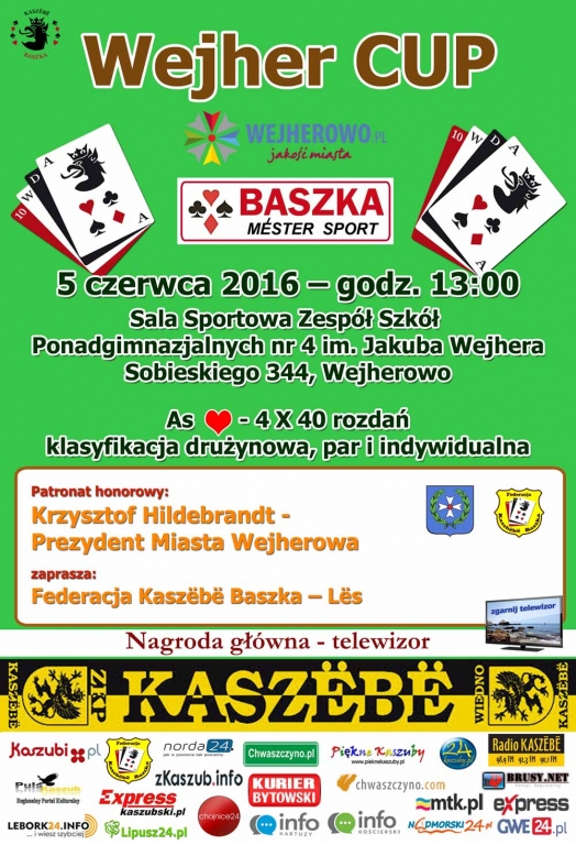 Wejher CUP, turniej dedykowany Jakubowi Wejherowi, odbędzie się 5 czerwca w Wejherowie. Turniej rozgrywany zostanie wg obowiązujących przepisów gry – Baszka Méster Sport, z asem serce – tzw. „Czerwona Baśka”.
