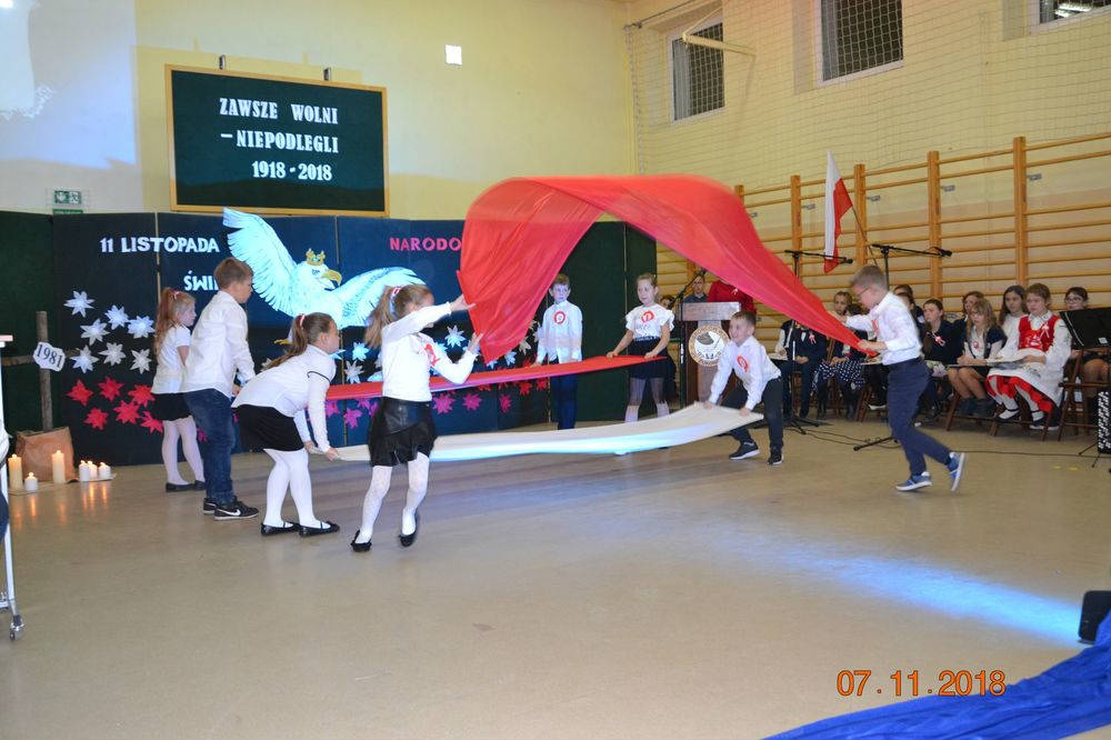 W sali gimnastycznej odbyła się Wieczornica Niepodległościowa – spotkanie uczniów, rodziców, nauczycieli, sympatyków szkoły i przedstawicieli władz miasta. Program artystyczny zapewnił gościom chwile patriotycznej zadumy i wzruszenia oraz niepodległościowej radości. Uczniowie, przygotowani przez pedagogów, zadbali o różnorodność występów recytatorskich, wokalno-muzycznych i tanecznych. Na szczególnie duży aplauz zasłużyli trzecioklasiści, którzy wystąpili z układem choreograficznym zawierającym elementy tańca z flagami. Dzieci, podopieczni Bogumiły Bundt, brawurowo wykonały pokaz eksponujący polską flagę – jej piękno i historię ukrytą w dwóch kolorach.