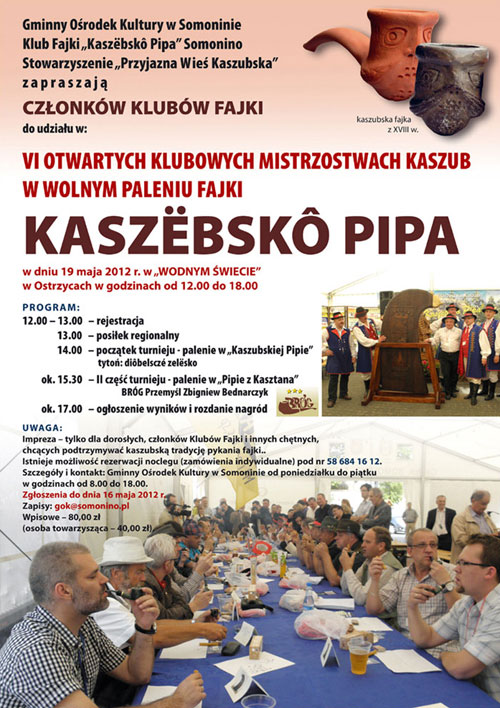 Kaszubski Klub Kolekcjonerów Fajki „KASZËBSKÔ PIPA” zaprasza na X Jubileuszowe Międzynarodowe Mistrzostwa Kaszub w Wolnym Paleniu Fajki. Odbędą się one 28 maja w Ośrodku „Wodny Świat” w Ostrzycach.