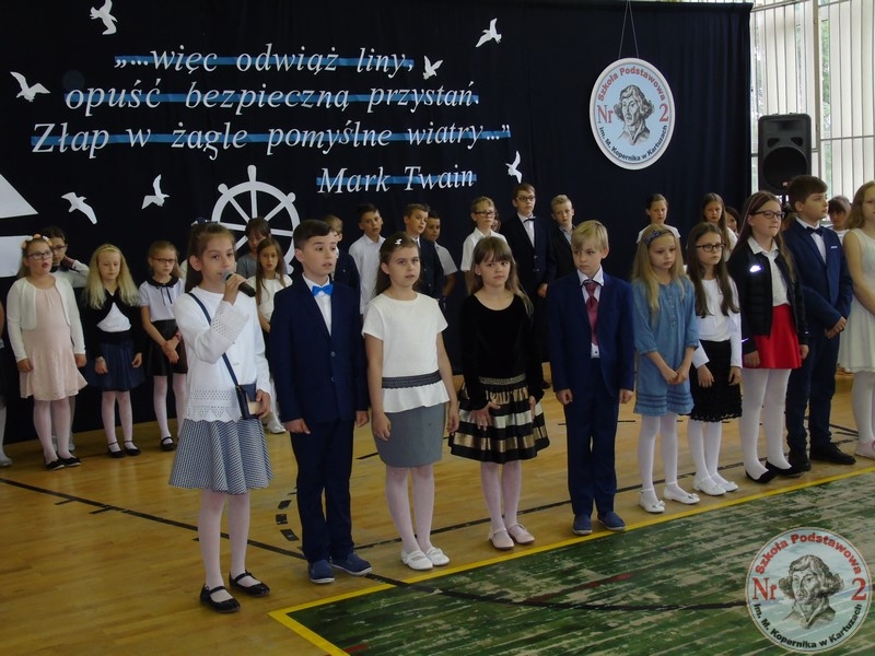 Powitaniu wakacji w szkole w Kartuzach towarzyszyły słowa Marka Twaina „..więc odwiąż liny, opuść bezpieczną przystań. Złap w żagle pomyślne wiatry..”