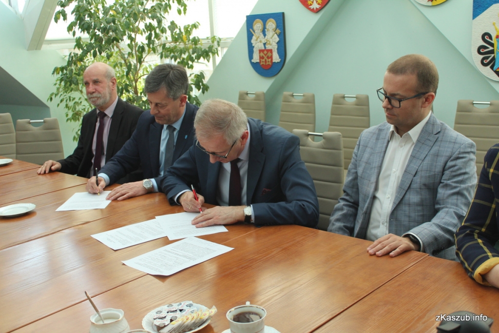 Dziś doszło do podpisania umowy pomiędzy Powiatem Kartuskim, reprezentowanym przez Starostę Bogdana Łapę i Wicestarostę Piotra Fikusa a Prezesem Zarządu firmy ELWOZ, Markiem Julkiem.