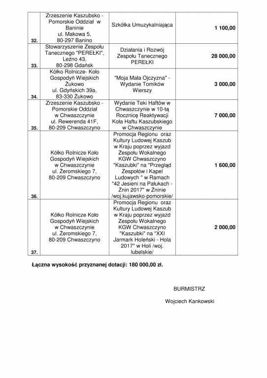 Burmistrz Gminy Żukowo przyznał dotacje na 2017 r. na realizację 37 zadań w zakresie kultury, sztuki, ochrony dóbr kultury i dziedzictwa narodowego. Zobacz, kto i na co dostanie pieniądze od gminy Żukowo.