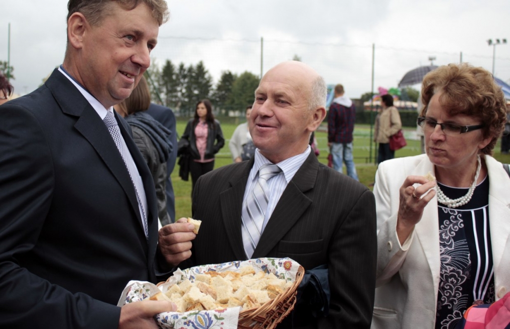 Przekazanie chleba, wypieczonego z tegorocznego ziarna, przez starostów dożynek  Janinie Kwiecień staroście kartuskiemu i Andrzejowi Wyrzykowskiemu wójtowi gminy Przodkowo odbyło się na scenie. Nim to jednak nastąpiło włodarze witali gości. Trwało to dość długo. W końcu jednak powitali i bohaterów święta plonów. Przekazane bochny chleba trafiły w ręce starosty i wójta. Ci częstowali nim zgromadzonych na stadionie mieszkańców gminy.