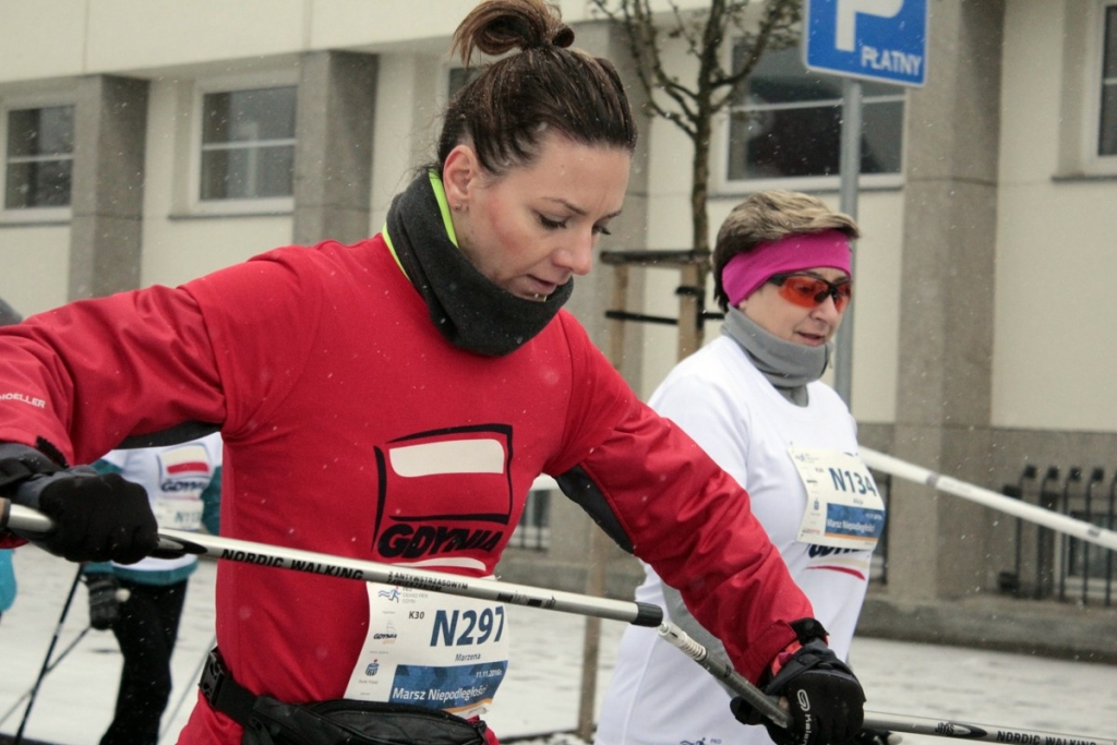 Marsz Niepodległości w Gdyni, który poprzedził doroczny Bieg Niepodległości, odbył się w piątkowe przedpołudnie. Aura nie sprzyjała zawodnikom. Padał śnieg, było ślisko. A jednak zawody nordic walking zgromadziły na starcie ponad 280 sportowców.