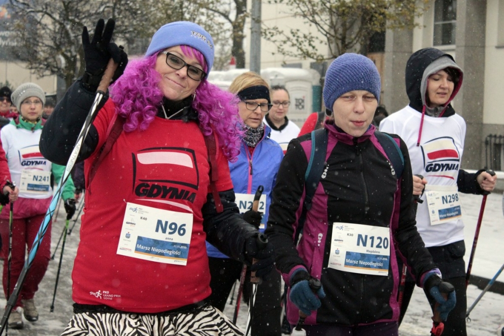 Marsz Niepodległości w Gdyni, który poprzedził doroczny Bieg Niepodległości, odbył się w piątkowe przedpołudnie. Aura nie sprzyjała zawodnikom. Padał śnieg, było ślisko. A jednak zawody nordic walking zgromadziły na starcie ponad 280 sportowców.