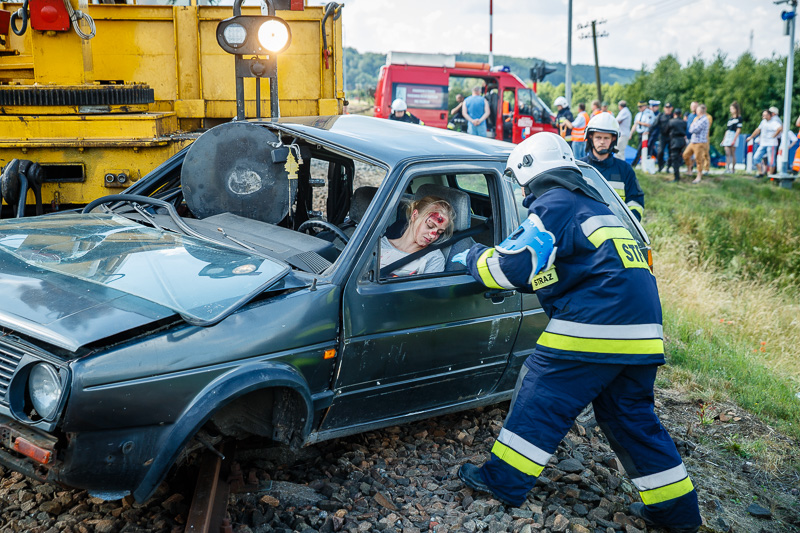 Śmierć czyha na przejeździe kolejowym. We wtorek w Somoninie doszło do symulowanego wypadku. Volkswagen golf uderzył drezynę. Byli ranni. Zobacz zdjęcia!