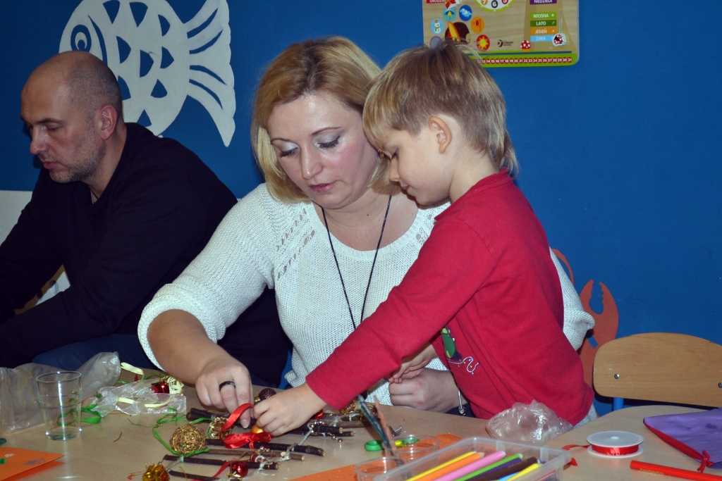 Rodzice z dziećmi przygotowali świąteczne ozdoby i kartki. Do wyboru mieli całe mnóstwo kolorowych kartek, farb i różnych dodatków, więc każda ozdoba była wyjątkowa. Wychowawczynie grupy „Rybek” – Sandra Zoch i Monika Plichta zadbały o to, żeby nikomu niczego nie zabrakło.