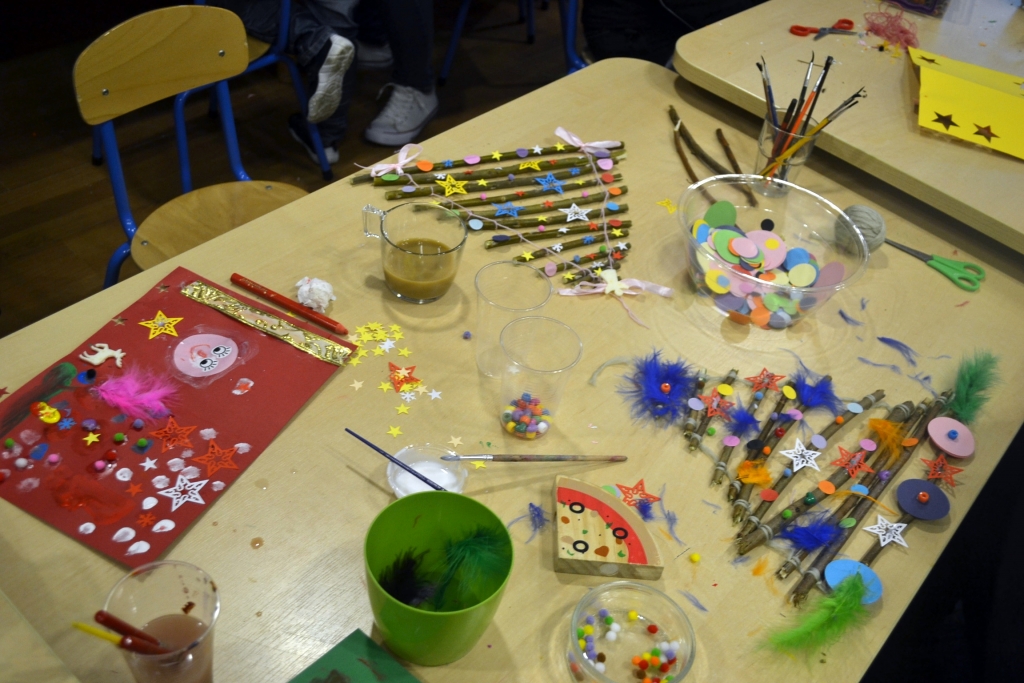 Rodzice z dziećmi przygotowali świąteczne ozdoby i kartki. Do wyboru mieli całe mnóstwo kolorowych kartek, farb i różnych dodatków, więc każda ozdoba była wyjątkowa. Wychowawczynie grupy „Rybek” – Sandra Zoch i Monika Plichta zadbały o to, żeby nikomu niczego nie zabrakło.