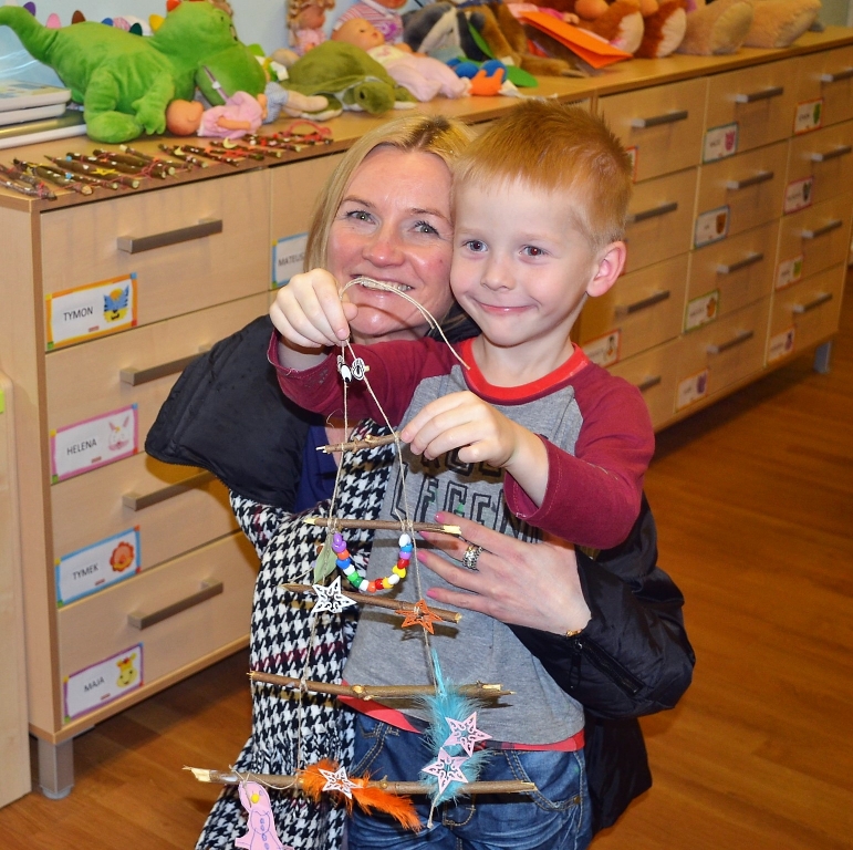 Rodzice z dziećmi przygotowali świąteczne ozdoby i kartki. Do wyboru mieli całe mnóstwo kolorowych kartek, farb i różnych dodatków, więc każda ozdoba była wyjątkowa. Wychowawczynie grupy „Rybek” – Sandra Zoch i Monika Plichta zadbały o to, żeby nikomu niczego nie zabrakło.